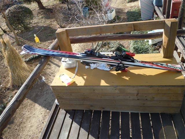 引越しの荷物の中からスキーの板を持ってきて、準備します。