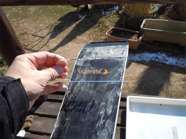 このプラスティックの板(スクレーパ)を板の滑走面に押し当てて、余分なワックスをこそぎ落としていきます。