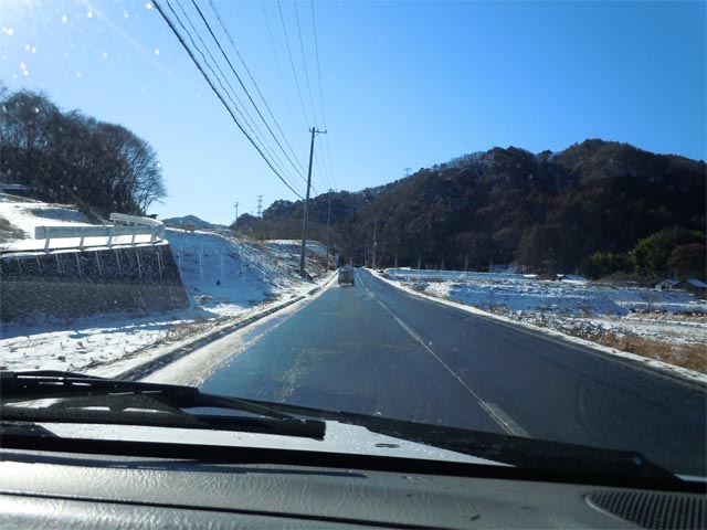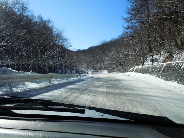 家の辺りでも、夜中に少し降ったようで、車に薄っすら粉雪が積もっていましたが、道も大門峠の下の辺りではかなり融けていたものの![]()