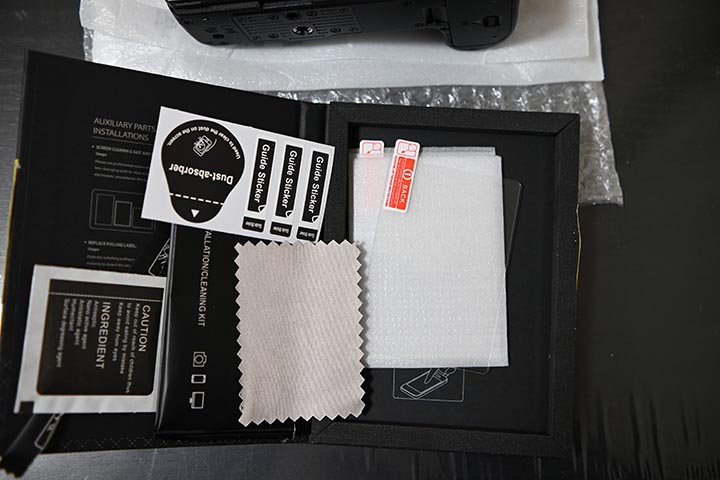 裏のチルト液晶に保護フィルターをうつけるのに、届いていた保護フィルターの箱を開けたところ。(Z30撮影)