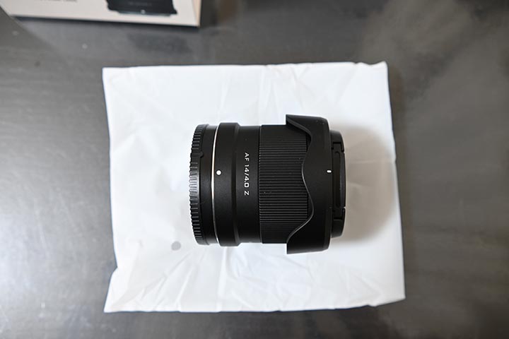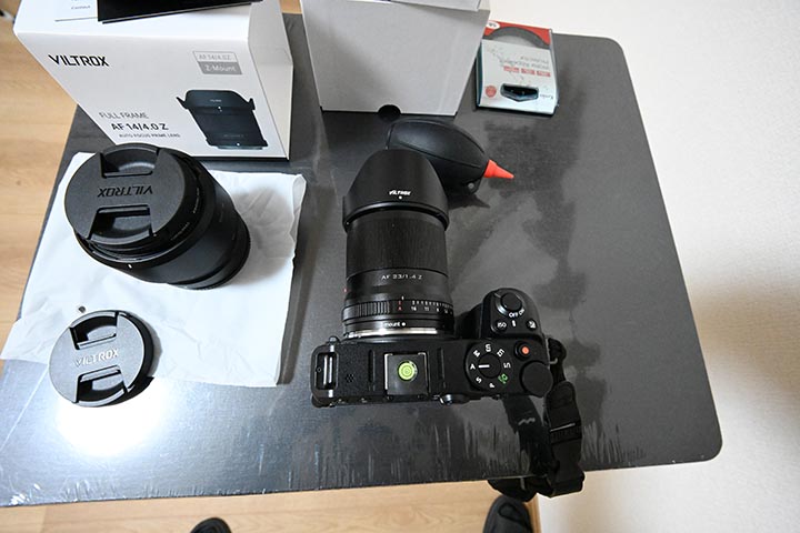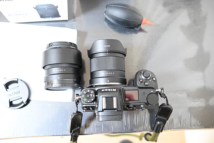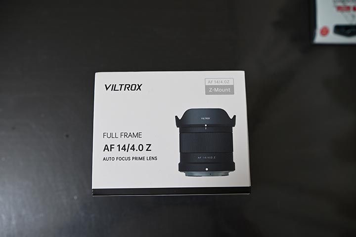 左の厚みのある袋に入っていたのはVILTROXのフルサイズ用超広角単焦点レンズ AF 14mm F4.0 Z。(Z30撮影)