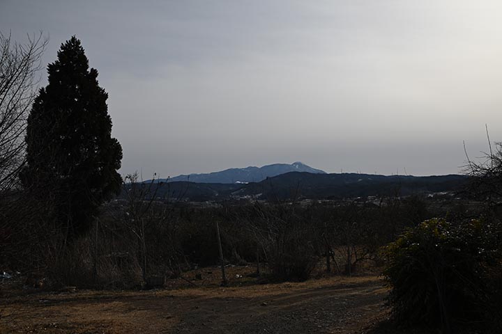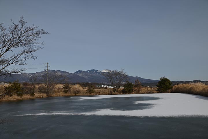 隣の農業用池とその向こうの浅間山。(Z30撮影)