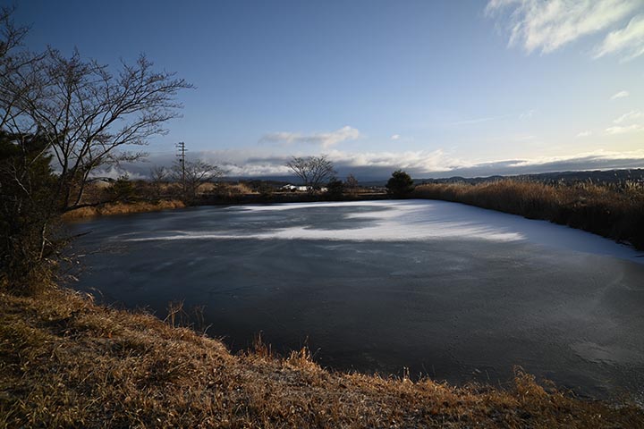 隣の農業用池を見ると全面結氷したままです。(Z5撮影)