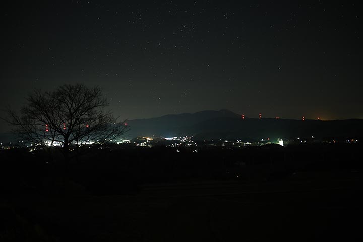 蓼科山のシルエットと山の後ろ側の明かりはスキー場でしょうか。
