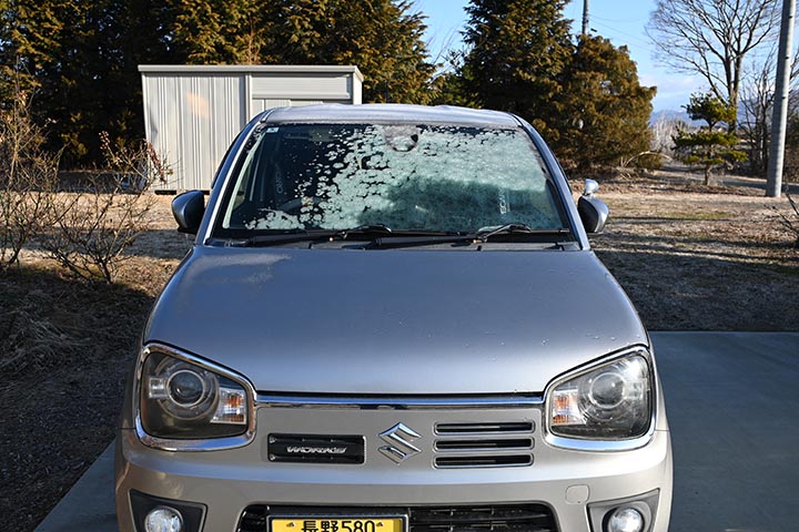 アルトの屋根とフロントガラスに夜露が降りて凍っていました。(Z30撮影)
